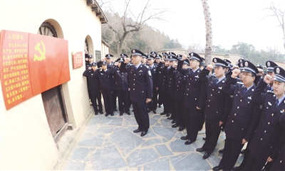 日前,河北边检总站组织党员民警赴西柏坡开展以“不忘初心、牢记使命,做新时代忠诚国门卫士”为主题的党课教育活动,教育广大党员民警大力弘扬“西柏坡精神”,牢记“两个务必”,奋力开创新时代出入境边防检查事业新局面。图为边检总站党员民警在党的七届二中全会旧址前进行宣誓