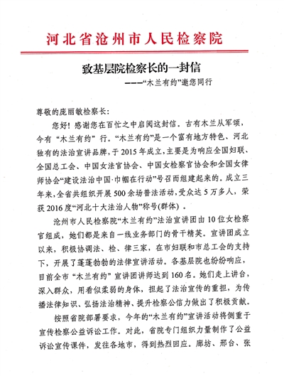 以职业视角、慈母情怀,向社会传递法治声音、传播人间温暖。2018年以来,我省“木兰有约”宣讲团重点围绕检察公益诉讼工作宣讲180多场,其中邢台62场,沧州29场,廊坊22场,张家口30场等。