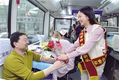 3月5日是学雷锋纪念日,石家庄多地开展了形式多样的义务劳动及送温暖等志愿服务活动,以实际行动传承雷锋精神。当天,在新乐市文化广场的献血车上,献血群众排队进行献血检查。图为志愿者向无偿献血群众送上鲜花。