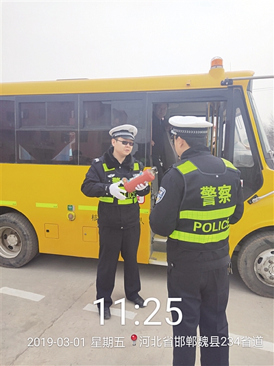 为进一步加强辖区校车交通安全管理,确保车辆安全行驶,有效预防和减少涉及中小学生道路交通事故的发生,3月1日,魏县交警大队联合多部门深入牙里镇开展校车安全检查活动。图为交警对校车上的灭火器进行检查。 范一杰 摄