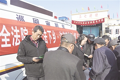 张家口市万全区人民法院充分发挥“一乡一庭”职能,借助乡村“唱大戏”赶大集人流量大、文化氛围浓、群众参与度高的特点,开展“送法下乡·法律宣传赶大集”活动,使得基层普法工作取得了明显效果。图为日前该院乡镇法庭干警在旧堡村大集上为村民发放法律常识宣传单的情景。 孟庆山 摄
