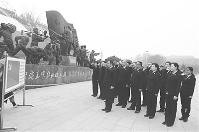 鸡泽县人民检察院近日组织全院检察人员先后赴临西县吕玉兰纪念馆、邱县法治教育基地、邢台前南峪抗日军政大学纪念馆等地接受红色教育,弘扬优良传统。图为鸡泽县检察院党组书记、检察长程学峰带队在抗日军政大学纪念馆前重温入党誓词的场面。 史国强 黄金敏 摄影报道