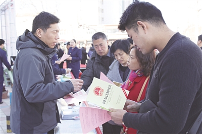 为促进商户诚信经营,引导消费者依法维权,3月15日上午,邢台市桥东区司法局会同该区市场监管局、区消费者协会围绕“信用让消费更放心”主题,在冀南装饰城开展2019年“3·15”消费者权益日法治宣传活动。活动现场设置了宣传、咨询、投诉服务台,工作人员向群众发放消费维权宣传页、日常实用法律知识手册等宣传材料2000余份。图为工作人员为群众答疑解惑,提供法律咨询服务。