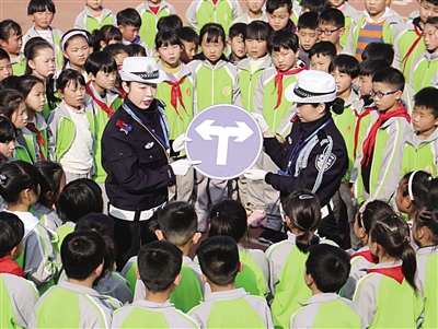 3月25日是全国中小学生安全教育日,邯郸市肥乡区第二实验小学开展形式多样的安全教育活动,普及各类安全知识,增强学生们的安全意识。图为交警正在向学生们讲解交通安全标志名称。