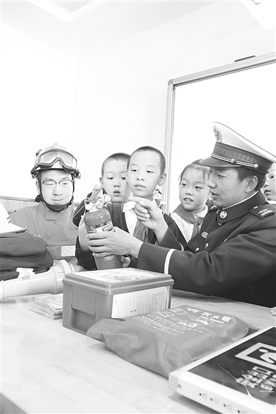 图④“抓紧灭火器,要对准着火点!”石家庄市裕华区消防大队消防人员走进建华东路小学,现场为学生们介绍灭火器、灭火毯、防毒面具等消防器材的使用方法。本报记者 鲍娜军 摄