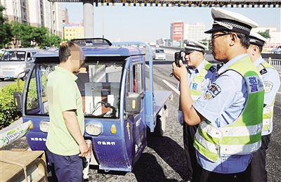 位于沧州市区的黄河路高架桥是该市东西方向一条重要的主干道和快速路,桥上全部为机动车道,禁止非机动车通行。上午7时20分左右,一名中年男子骑着电动车从高架桥上由西向东驶过来,被执勤的交警二大队民警当场拦住。执勤民警向男子讲解了在高架桥上骑行的危害后,依法对其处以罚款10元的处罚。随后,民警又在高架桥上接连发现了两辆货运三轮车,在往来车流中十分危险。当执勤民警询问三轮车驾驶人是否清楚禁行限制时,一名驾驶人表示知道,但是因为桥上宽敞、开得快,依然不顾危险驶入高架桥。随后,执勤民警将这两辆电动三轮车扣留,并对驾驶人进行了处罚。