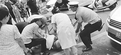 8月11日上午11时50分,高碑店市兴化北路上,一辆停放在人行道上的轿车车门打开时,与一辆电动车发生碰撞,导致电动车驾驶人头部受伤,倒地不起。正在巡逻的高碑店交警城区中队民警迅速赶到现场救援,并拨打了120。救护车赶到后,民警帮助医务人员把伤者抬上救护车送往医院。图为救援现场。 吴迎春 摄