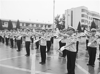 石家庄第五届旅游产业发展大会将于9月11日至12日在井陉县和井陉矿区举办。为做好旅发大会期间道路交通安保工作,井陉县公安交警大队从8月24日至27日,分两期对全体民警和辅警集中开展“强素质、树形象、迎旅发”警务实战训练。图为8月24日一大早,冒着沥沥小雨,首期参训的60多名民警和辅警进行队列和交通指挥手势训练。