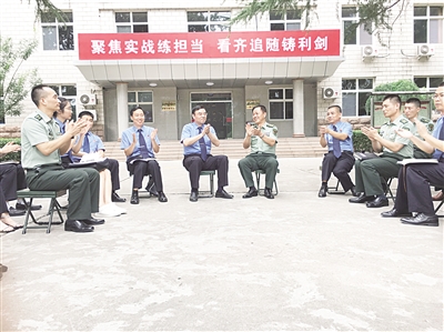 下午3时45分。营队楼前的空地上,30把军用马扎围圈摆放。在笔直高大的松柏树下,伴着清脆的蝉鸣,大家间隔而坐,围绕推动“不忘初心、牢记使命”主题教育向更深层发展、党支部建设、维护军队军人家属合法权益等工作进行深入交流。省检察院办公室3名同志、石家庄军事检察院3名同志,结合各自情况,分别发言讲体会、谈见解。
