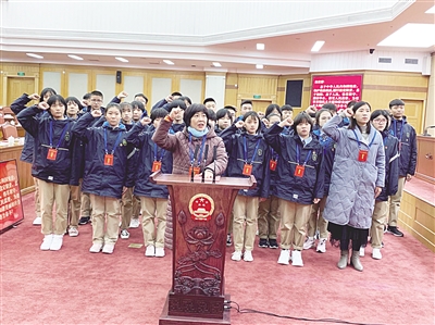 12月2日上午,30余名师生代表受邀走进省人大常委会机关,参加了以“宣传贯彻学校安全条例”为主题的开放日活动。师生们通过集体参观、现场讲解、模拟示范、宪法宣誓等活动,了解了人民代表大会及其常委会的基本情况和职责,以及《河北省学校安全条例》的立法背景和过程。图为学生们在老师的带领下,庄严地进行宪法宣誓。