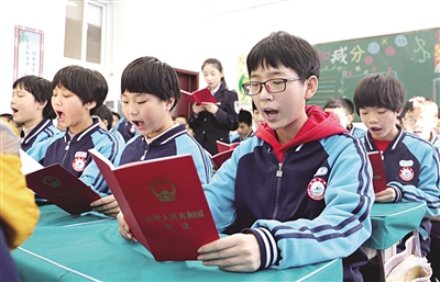 为弘扬宪法精神、树立宪法权威,12月3日,邯郸市永年区司法局工作人员走进辖区洺州中学,开展“宪法在我心中”系列主题教育活动,通过开设宪法小课堂、绘制宪法手抄报、诵读宪法读本等形式,让孩子们更多地了解宪法知识。图为永年区司法局工作人员和学生们一起诵读宪法。 胡高雷 摄
