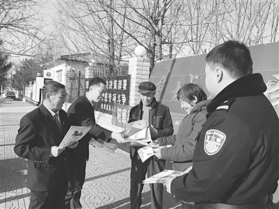 11月28日,阳原县人民法院依托“一乡(镇)一法庭”,在县内各乡镇开展“法治新农村”创建活动。干警们悬挂条幅、发放宣传资料、讲解法律知识、接受群众现场咨询等,用通俗易懂的语言向群众详细讲解了与村民生活息息相关的婚姻法、土地管理法、合同法等法律法规。此次活动共计发放宣传材料1800余份,解答群众咨询270余人次,增强了群众的法治意识和法治观念。图为干警向群众发放宣传资料。 本报记者 梁燕 摄