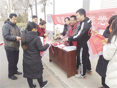 邯郸市峰峰矿区彭城镇积极开展扫黑除恶宣传工作,提升群众参与意识,深挖黑恶问题线索。今年以来,该镇已发放宣传手册2000余册,张贴公告1000张,发放明白纸5000份,悬挂条幅和标语300余条,组织社区村庄小型宣传20余场次,收效良好。图为工作人员向群众发放宣传材料。 郑凯 单志松 摄