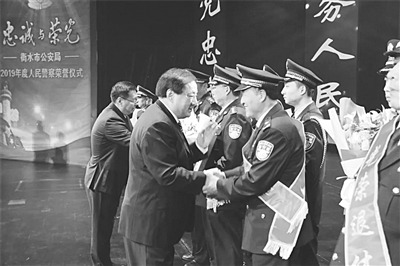 本报讯 (记者 张兰华 通讯员 郭建博)近日,衡水市公安局举行“忠诚与荣光”2019年度人民警察荣誉仪式,衡水市委书记王景武,市长吴晓华,市人大常委会主任王金刚,市政协主席李洪林,市委常委、政法委书记钮兴辉等分别为立功受奖集体、民警代表和退休民警代表颁发奖章、证书和荣休纪念匾。市委、市人大、市政府、市政协、市直有关部门领导、2019年度退休民警代表、新招录民警代表、立功受奖集体和民警代表、全市公安系统民警及广大民警家属代表共计1000余人参加了仪式。