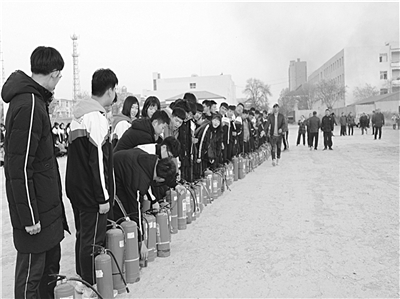 近日,孟村回族自治县消防救援大队深入辖区中学开展消防安全培训,进一步加强了学校消防安全教育,提高了师生的消防安全意识,增强了师生处置初期火灾、紧急疏散、自救与逃生的能力。图为消防人员在指导学生使用灭火器进行灭火演练。 赵志鹏 摄