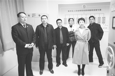 定州市检察院党组书记、检察长刘斐等一行8人围绕落实高检院“三位一体”要求,于近日到衡水市冀州区检察院就检察工作、队伍建设、检察宣传等进行交流。冀州区检察院党组书记、检察长刘伟,故城县检察院党组书记、检察长朱同辉等一同进行了交流互通。图为刘伟在向大家介绍冀州区检察院6A级档案室管理运行情况。 刘延岭 摄影报道