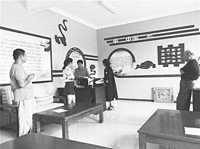 根据家事审判的特点与需求,吴桥法院加强文化传承试点法庭硬件设施配置。其中,桑园法庭调解室镶有孔子画像,墙面附古今经典家事故事、夫妻劝和歌等;于集法庭分设心理疏导区、亲子互动区、家事调解区,室内配备复古圆桌;曹洼法庭精心设计了赋予“和”文化载体的百和墙及祥云壁画,寓意渊源共生,和谐共荣。