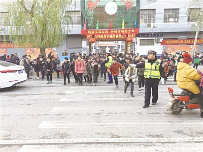 每到学生放学时段,魏县第三完小附近电动车、自行车、机动车乱停乱放非常严重,存在极大的交通安全隐患。今年以来,魏县交警大队城区中队民警坚持每天到学校门口站岗执勤,疏导交通,维持交通秩序,护送学生安全过马路,有效保障了师生的出行安全,受到了师生和学生家长的赞扬。图为民警护送学生安全过马路。 范一杰 摄
