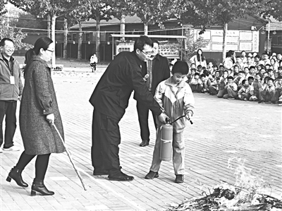 近日,肃宁县消防救援大队深入辖区第一实验小学,开展消防安全培训。消防人员针对学校火灾特点,深入浅出地为师生讲解了常见火灾及处理方法、遇到火灾时的逃生自救方法等消防知识,并组织师生开展了灭火疏散逃生演练。图为消防人员在指导学生正确使用灭火器。 康伟卿 宋从昊 摄